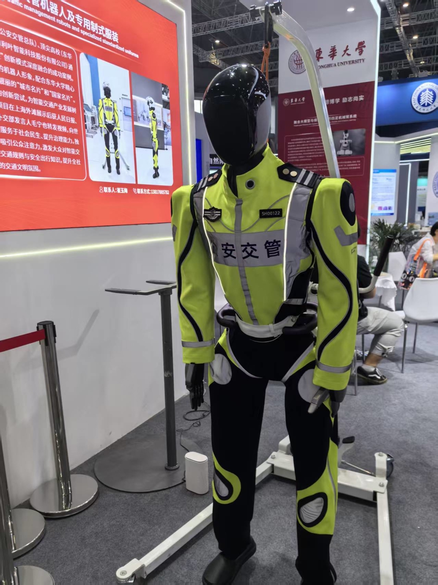 东华大学展台前,挤满了观看一个身穿交管制服的机器人工作的观众。该机器人此前曾亮相于上海市黄浦区南京东路和中山东一路交叉口,并引发热议。霓虹灯下,人行横道旁,这个机器人头戴警帽、身披反光背心,用标准的手势为车流和行人发出指示。该机器人就是由上海公安交管总队、东华大学、上海傅利叶智能科技股份有限公司合作研发的公安交管机器人。