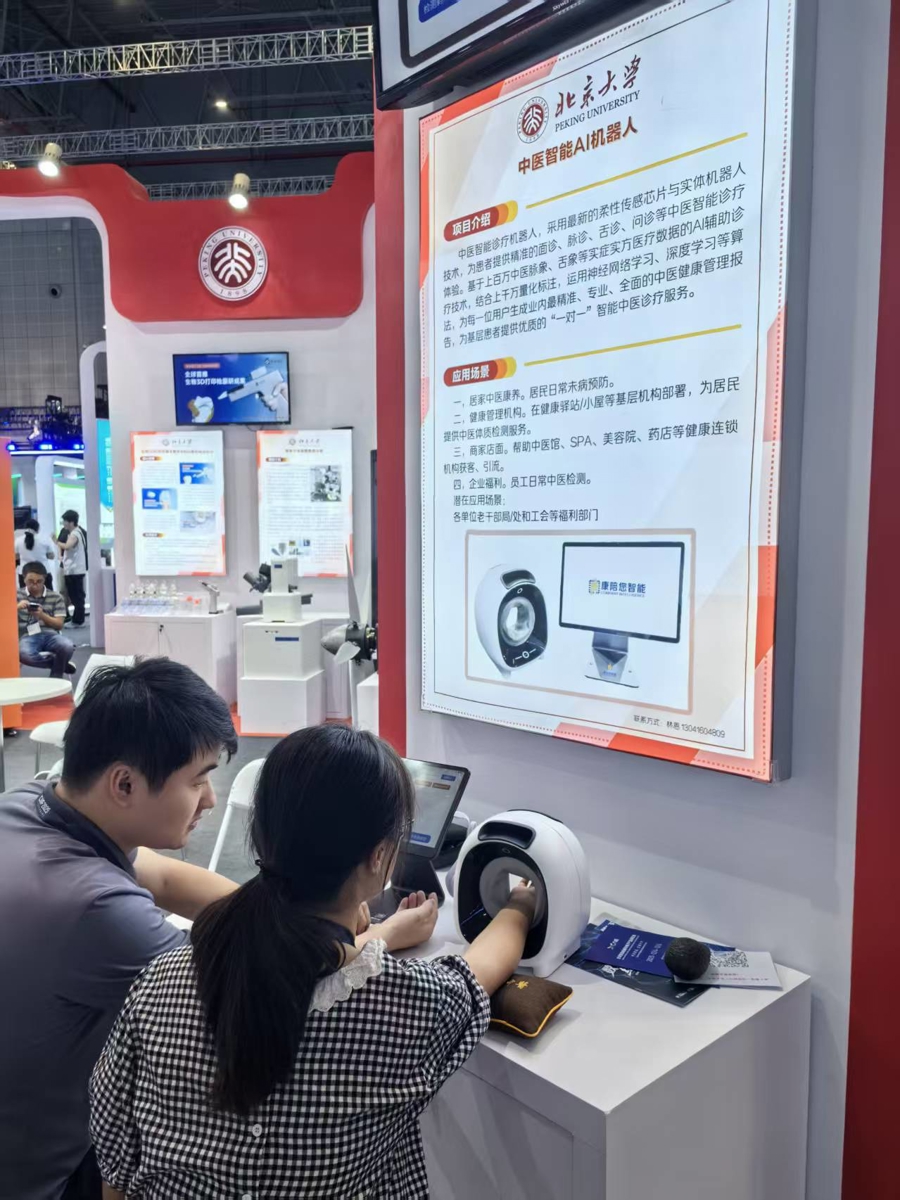 在工博会高校展区中,采用最新的柔性传感芯片与实体机器人技术,为患者提供精准的面诊、脉诊、舌诊、问诊等中医智能诊疗体验。北京大学基于上百万中医脉象、舌象等实证实方医疗数据,运用神经网络学习、深度学习等算法打造了一款“中医智能AI机器人”,它可以为每一位用户生成精准、专业、全面的中医健康管理报告。该项目也引来了不少观众驻足。