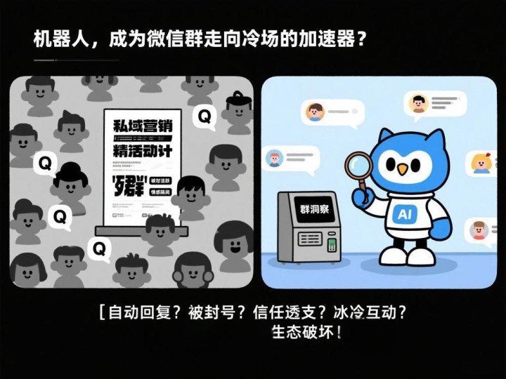 这是最致命的一点。机器人或许能帮你“执行”任务,但它永远无法告诉你“为什么”要这么做。你的成员最喜欢讨论什么话题?哪个时间段发言最踊跃?哪些是潜在的KOC(关键意见消费者)?哪些负面情绪正在酝酿?……面对这些决定社群生死的关键问题,机器人沉默不语。你依然在凭感觉运营,缺乏数据支撑的决策,就像在黑暗中射击,命中全靠运气。结论很残酷:一个只会机械回复的机器人,非但不能拯救你的社群,反而会加速它的死亡。它用表面的忙碌,掩盖了策略的懒惰;用短期的便利,透支了长期的信任与安全。